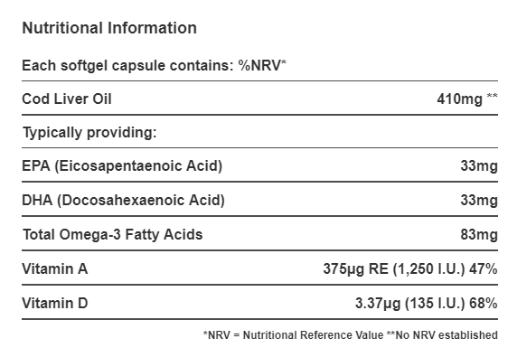 Cod Liver Oil (Fish) (source of Vitamins A and D), Capsule Shell (Gelatine (Fish), Glycerine), Vitamin A (as Retinyl PaImitate), Medium Chain Triglycerides, Vitamin D3 (as Cholecalciferol), Antioxidant (dl-Alpha Tocopherol).